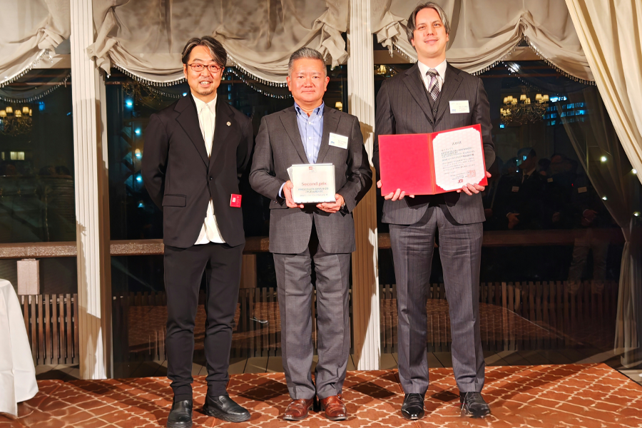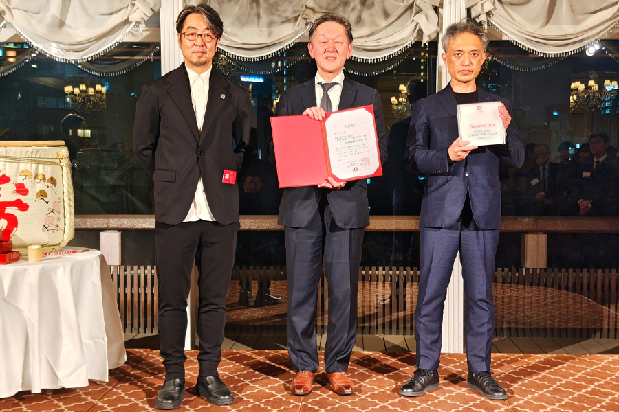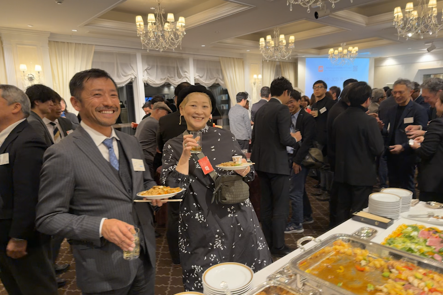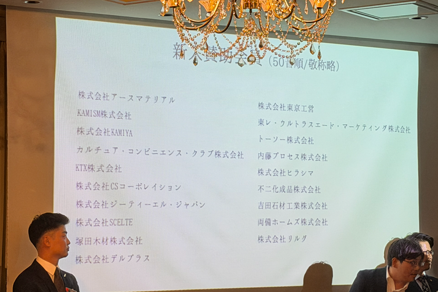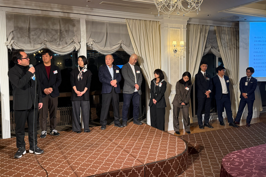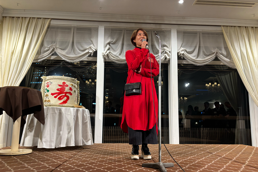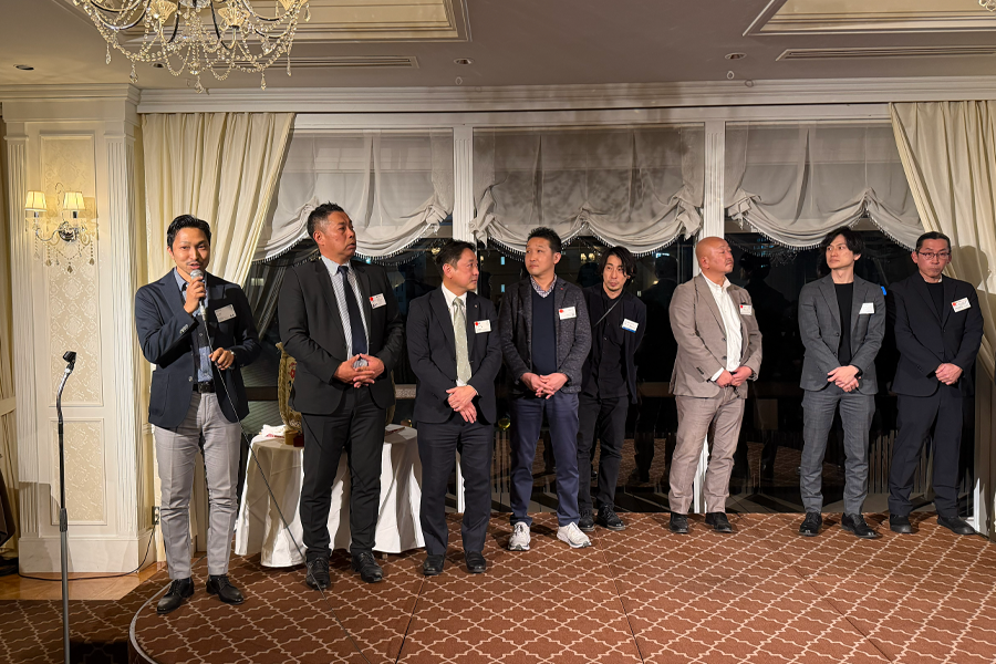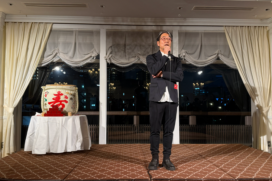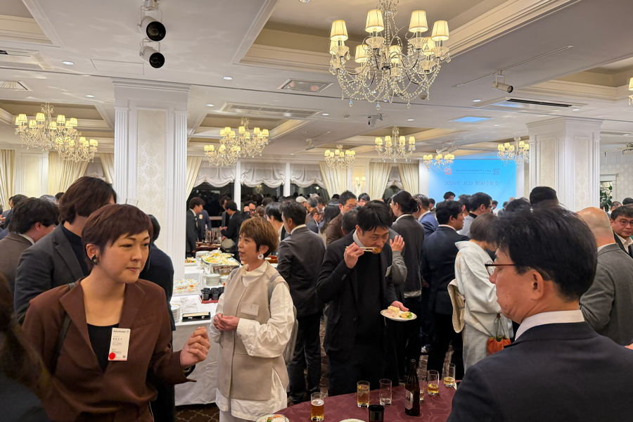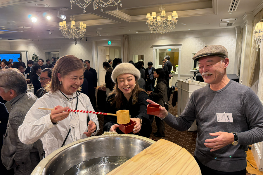 受賞者からは開発への想いや今後の展望が語られ、参加者は高い関心を寄せていた。新たに加わった新入賛助会員の紹介も行われ、協会のさらなる広がりを感じさせる場面となった。続いて、賀詞交歓会の恒例行事である鏡開きが行われた。来賓および関係者が登壇し、掛け声とともに力強く薦被りが開かれると、会場は一層華やかな雰囲気に。続く乾杯では、来賓代表の遠藤氏の発声のもと、参加者同士の歓談が和やかに始まった。終盤には折原副理事長による中締めが行われ、盛会のうちに閉会。新年の決意と交流を深める有意義な賀詞交歓会となった。
