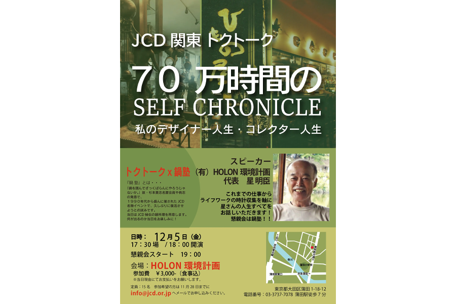 これまでのワークからライフワークの時計収集を軸に星さんの人生すべてをお話しいただきました。空間デザイナーとしてだけではなく、時計コレクターとしても活躍なさっているJCDの重鎮・星明臣さん。幼い頃にお父様を亡くしてからのご苦労とデザイナーを志すきっかけ、デザイナーとしての活動開始から独立に至るまでの足跡は波瀾万丈のお話。バブル期真っ只中の日本の空気感はこんなだったのかな〜と思わされるようなアメリカでの大規模プロジェクトについて、そして勤務先の倒産とドラマのような半生記を写真を交えお話いただきました。私生活では40代から始めた時計のコレクションにまつわるお話もたくさんしていただきました。星さん宅兼仕事場はさながら時計の博物館。その素敵な空間で大変な愛妻家でいらっしゃる奥様のプロのお料理をいただきながら、歓談の時を皆で過ごしました。